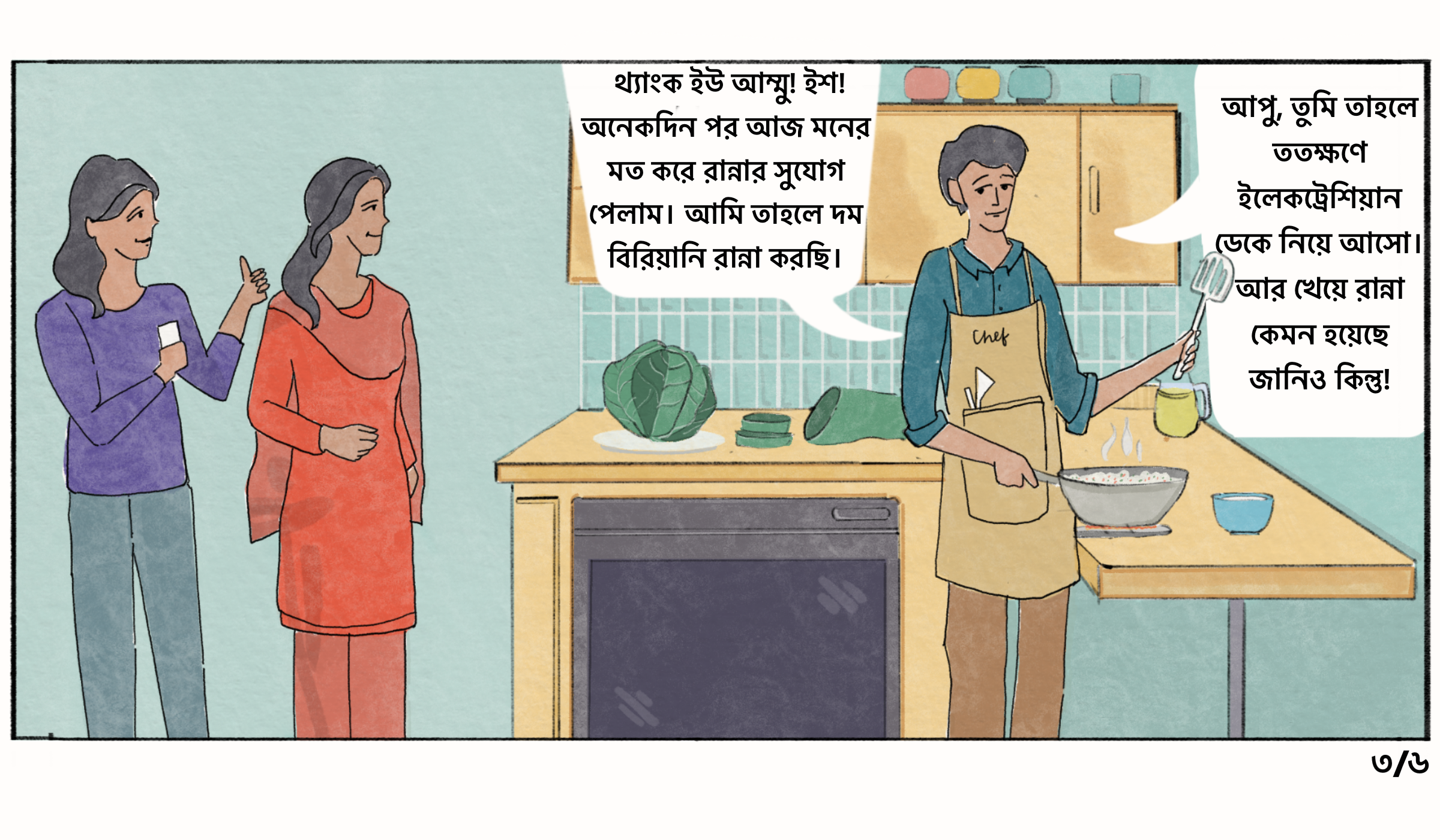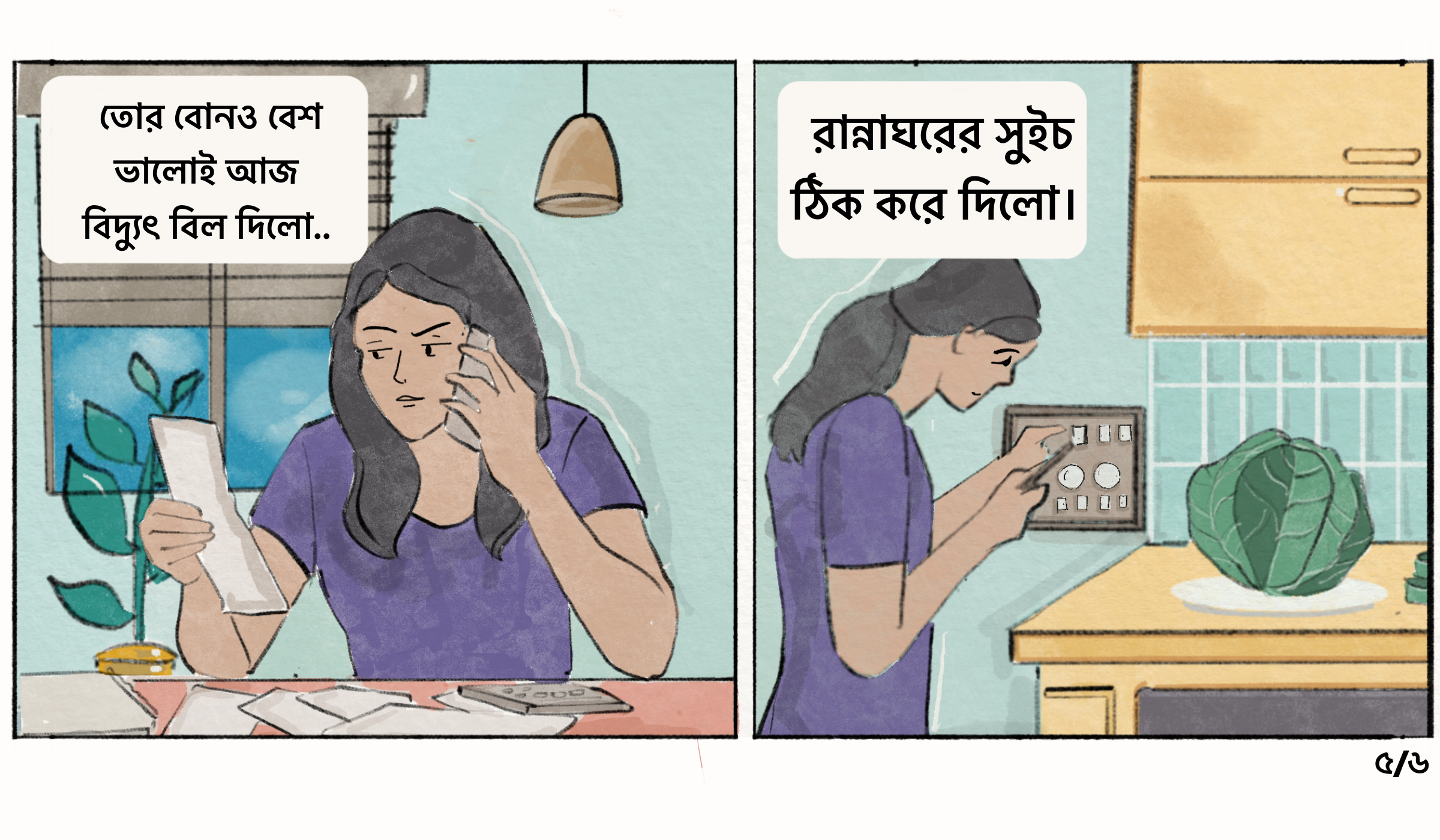 একটি বহুল প্রচলিত লিঙ্গবৈষম্যমূলক ধারণা হলো যে “পুরুষই পরিবারের প্রধান উপার্জনকারী।” এই দৃষ্টিভঙ্গি পুরুষদেরকে অর্থ উপার্জনের মূল দায়িত্বে স্থাপন করে, যেখানে তাদেরকে প্রায়শই উচ্চ-ঝুঁকিপূর্ণ বা প্রযুক্তিনির্ভর পেশায় নিয়োজিত হওয়ার প্রত্যাশা করা হয়। ফলস্বরূপ, পরিবারের আর্থিক সহায়তা প্রদানের দায়িত্বটি সামাজিকভাবে পুরুষদের ওপর ন্যস্ত করা হয়ে থাকে।পুরুষদের লিঙ্গভিত্তিক নিয়মগুলিকে প্রতিরোধ করতে গার্হস্থ্য কাজের সামর্থ্যের প্রতি তাদের সংবেদনশীলতা বাড়াতে চেষ্টা করা উচিত। উদাহরণস্বরূপ, নারীরা কোনো অপরিচ্ছন্ন জায়গা দেখলে “আমার এটি পরিষ্কার করা প্রয়োজন” বলে ভাবতে পারেন, যেখানে পুরুষরা কেবল “ময়লা জমেছে” বলে লক্ষ্য করেন। ক্রমাগত সচেতন প্রচেষ্টা এবং অভ্যাস তৈরির মাধ্যমে আমরা কীভাবে বিশ্বকে উপলব্ধি করি তা আমরা পরিবর্তন করতে পারি এবং এই কমিক স্ট্রিপ আমাদের এই জিনিসটি বুঝতে সাহায্য করতে পারে। বিশেষ করে যেসব পরিবারে সন্তান রয়েছে, সেখানে প্রায়শই গৃহস্থালির কাজে সময় দেওয়া এবং পরিবারের যত্ন নেওয়ার বিষয়টি কে কেন্দ্র করে দ্বন্দ্ব দেখা দেয়। মহিলারা, চাকুরী থাকা সত্ত্বেও, গৃহস্থালির কাজে পুরুষদের থেকে উল্লেখযোগ্যভাবে বেশি সময় ব্যয় করেন। গবেষণায় দেখা যায়, যেসব পরিবারের সন্তানসহ দুজন অর্থ উপার্জনকারী থাকেন সেসব পরিবারের বেশি দ্বন্দ্ব এবং উচ্চ স্ট্রেস থাকার সম্ভাবনা বেশি থাকে গৃহস্থলীর কাজের অসমানুপাতিক অংশগ্রহণের জন্য। স্বাস্থ্যের উপর লিঙ্গ সমতার সূচকের ২০২১ সালের একটি রিপোর্টের থেকে দেখা যায়, ৯১% মহিলা যাদের সন্তান আছে, তারা অন্তত দিনে এক ঘন্টা গৃহস্থালির কাজে ব্যয় করেন; যেখানে পুরুষ যাদের সন্তান আছে, তাদের ক্ষেত্রে এটি ৩০%। সাম্প্রতিক পাওয়া ডাটা থেকে দেখা যায় যে, কর্মরত মহিলারা দিনে প্রায় ২.৩ ঘন্টা গৃহস্থালির কাজে ব্যয় করেন, যেখানে পুরুষরা করে থাকেন ১.৬ ঘন্টা।